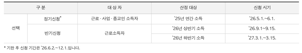| 반기신청 (26년 상반기) | 2026.9.1 ~ 9.15 | 2026년 12월 말 | 근로소득자만 가능 |