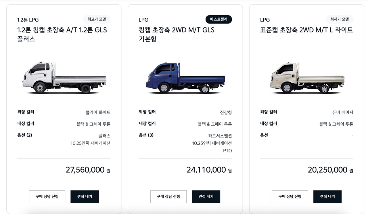 1.2톤 모델: 2,455만 원 ~ 2,560만 원 (2WD 초장축 킹캡, 6단 수동변속기 기준)