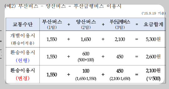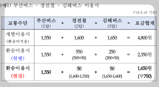 | 교통수단 | 기존 요금 (환승 적용 전) | 기존 환승 요금 | 변경 후 요금 (부산 환승 무료) |