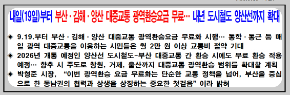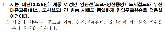 바로 2025년 9월 19일부터 ‘부산 김해 양산 대중교통 광역 환승 요금 무료’ 제도가 시행되었기 때문이죠!