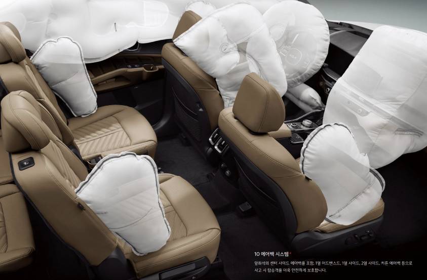 앞좌석의 센터 사이드 에어백을 포함, 1열 2열 사이드, 커튼 에어백 등으로 사고 시 탑승객을 더욱 안전하게 보호합니다.