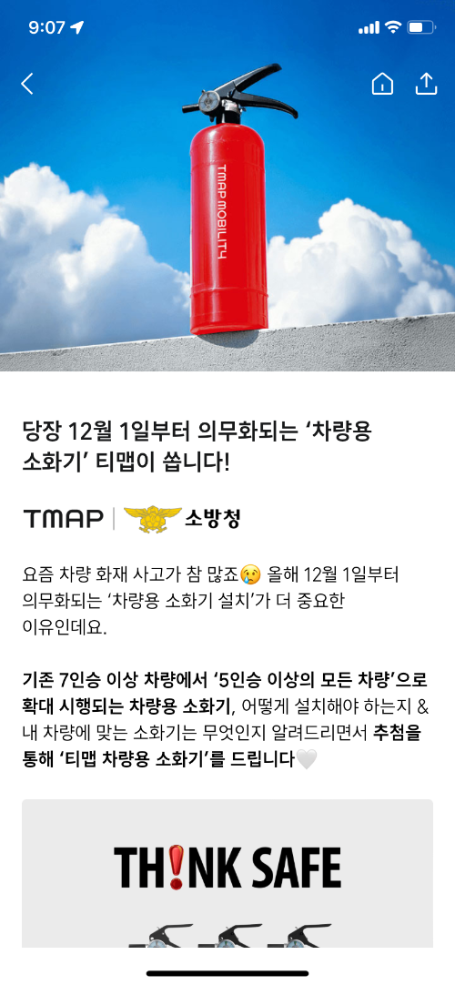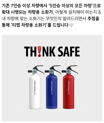 차량 소화기 의무화와 더불어 더 많은 운전자들이 안전운전에 동참할 수 있도록 소방청과 티맵모빌리티가 특별한 캠페인을 준비했습니다!